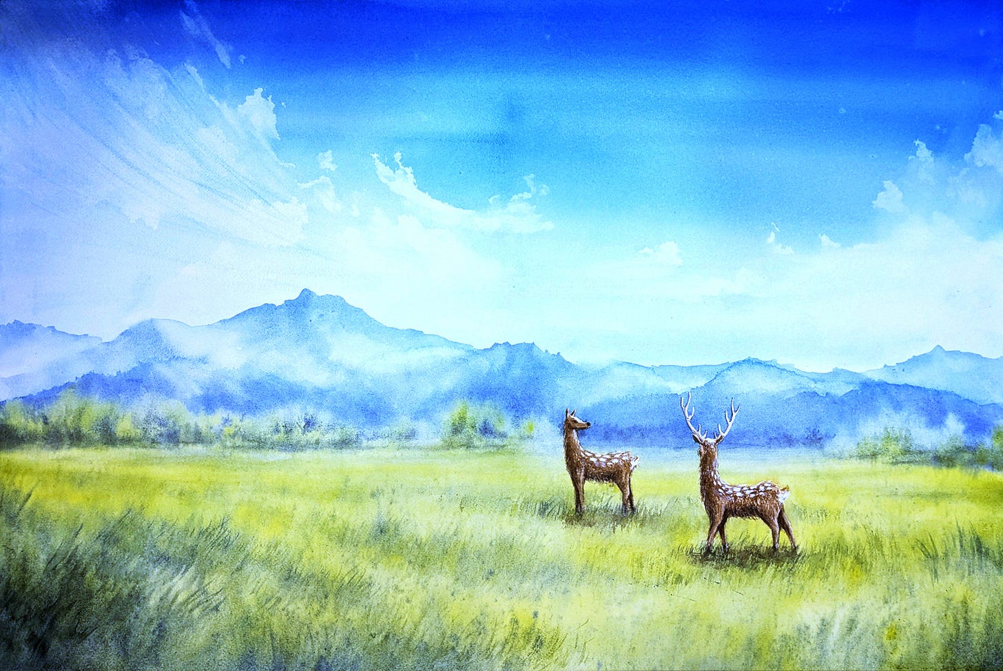 In this piece, I aimed to capture this summer’s vibe — the playful clouds, the rolling waves of grass, and the distant mountain range composed with a mix of fluid and precise shapes. I included a couple of elks to enjoy the scene and keep the viewer company :)